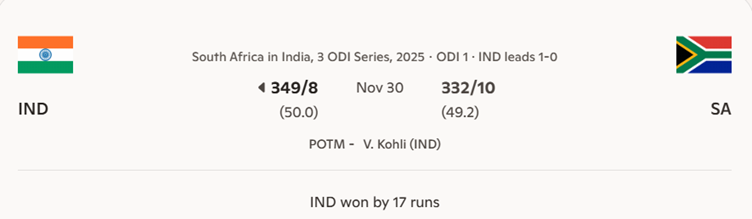 ಭಾರತವು ದಕ್ಷಿಣ ಆಫ್ರಿಕಾವನ್ನು 17 ರನ್‌ಗಳಿಂದ ಸೋಲಿಸಿ ಸರಣಿಯಲ್ಲಿ 1-0 ಮುನ್ನಡೆ ಪಡೆದಿದೆ. ವಿರಾಟ್ ಕೊಹ್ಲಿ–ರೋಹಿತ್ ಶರ್ಮಾ–ಕೆ.ಎಲ್. ರಾಹುಲ್ ಅವರ ಬ್ಯಾಟಿಂಗ್ ಹಾಗೂ ಹರ್ಷಿತ್ ರಾಣಾ–ಕುಲದೀಪ್ ಯಾದವ್ ಅವರ ಬೌಲಿಂಗ್ ಭಾರತಕ್ಕೆ ಕಠಿಣ ಹೋರಾಟದ ಬಳಿಕ ಯಶಸ್ಸು ತಂದುಕೊಟ್ಟಿದೆ. ಈ ಜಯವು ಭಾರತಕ್ಕೆ ಸರಣಿ ಗೆಲುವಿನ ದಾರಿಯನ್ನು ತೆರೆಯುವಂತಾಗಿದೆ.